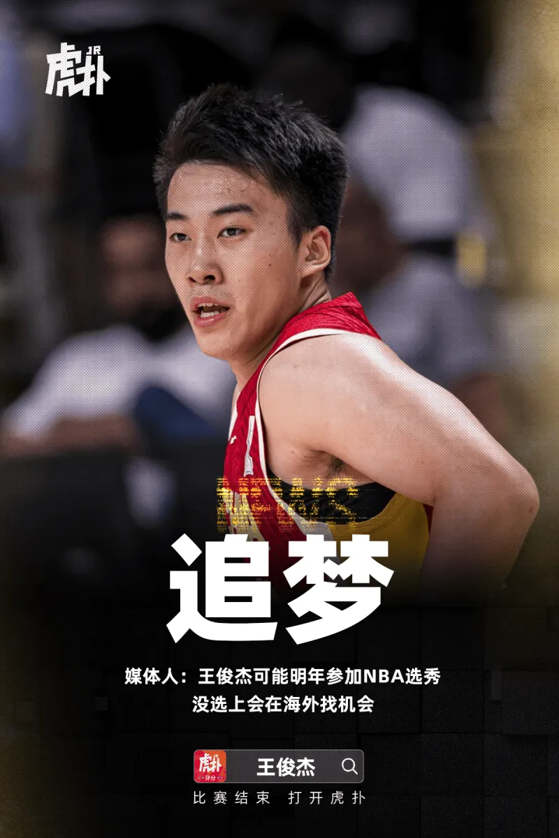 虎扑08月22日讯 今日,媒体人白晓篮社媒表示:王俊杰可能明年参加NBA选秀,25岁后才考虑其他选项